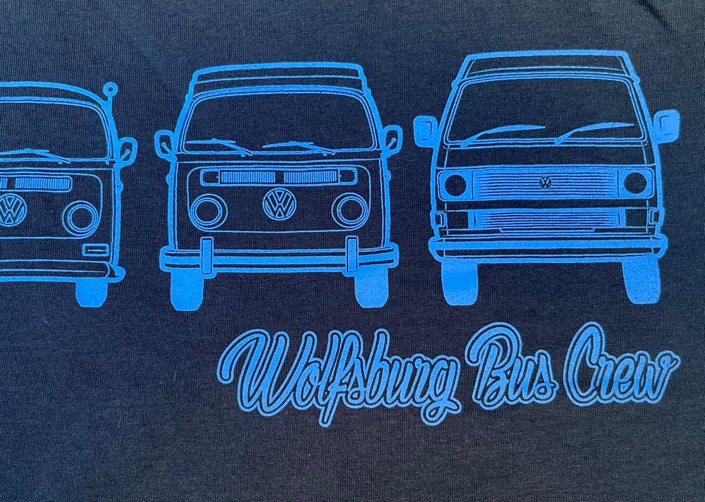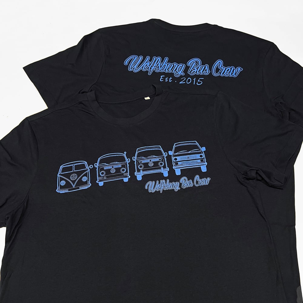 This is an order for a WBC Navy Blue T-shirt with Neon Blue print, the chest design is the front of a a slammed 23-window Samba, a custom US spec tin-top Early Bay, a deluxe Westfalia Late Bay and a California T3 with a Wolfsburg Bus Crew Script underneath • Shoulder design is extra large Wolfsburg Bus Crew with EST. 2015 underneath.