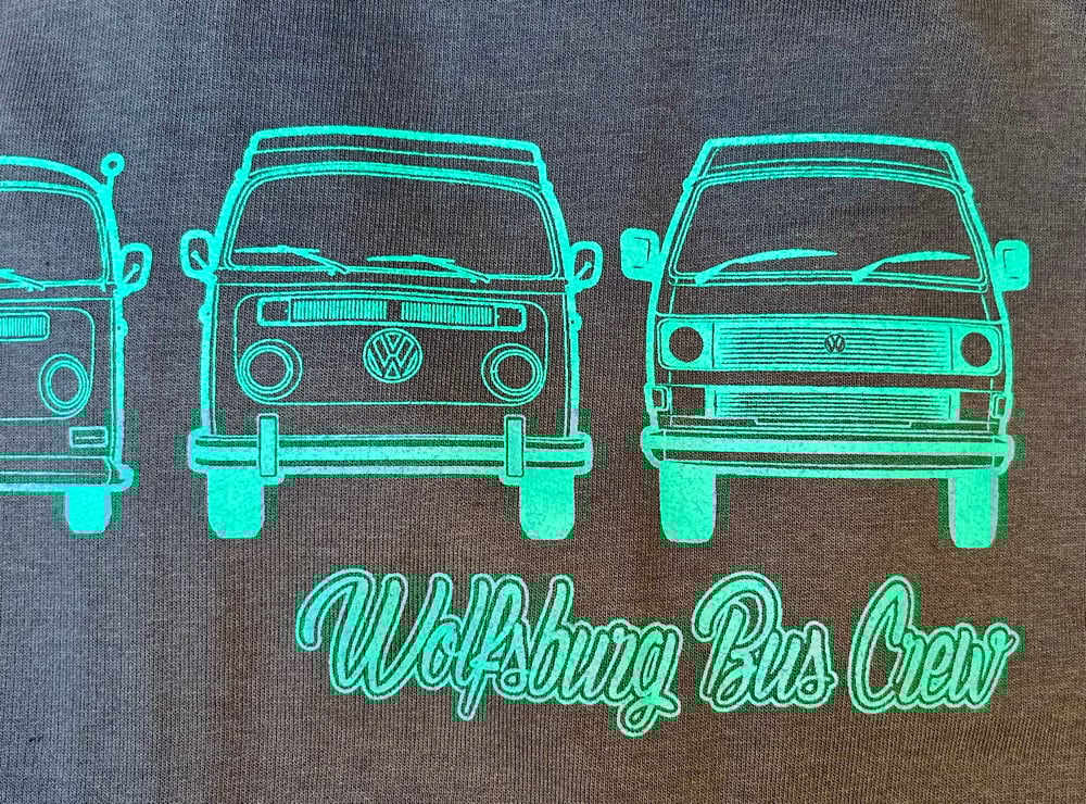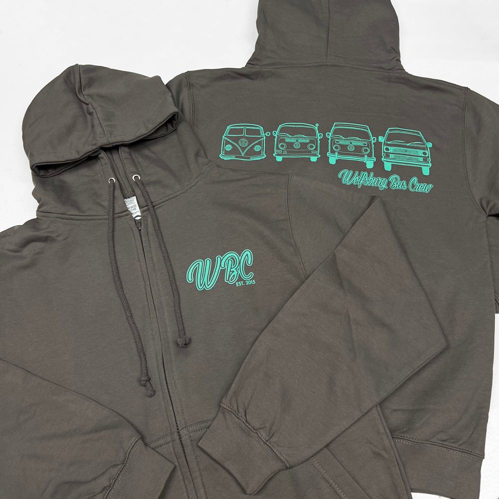 This is a order for a WBC fully zipped Hoodie in Steel Grey with a small Turquoise left chest print of the WBC logo and on the rear an extra large shoulder print featuring a front view of the following Buses: a slammed 23-window Samba, a custom US spec tin-top Early Bay, a deluxe Westfalia Late Bay and a California T3 with a large Wolfsburg Bus Crew Script underneath.